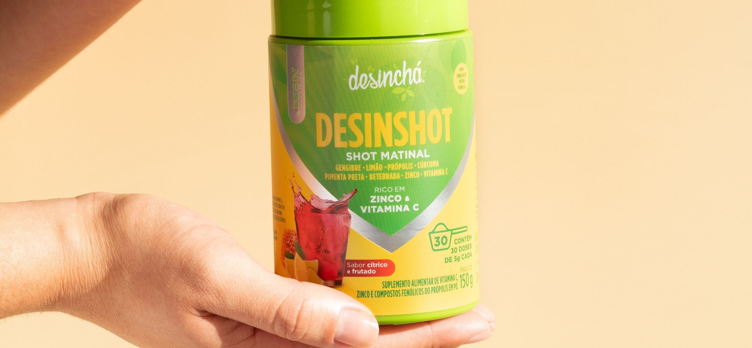 Na fórmula de Desinshot encontramos a incontornável Vitamina C, mas também outros ingredientes com função antioxidante e propriedades antibacterianas e fúngicas como o gengibre, cúrcuma e o própolis.