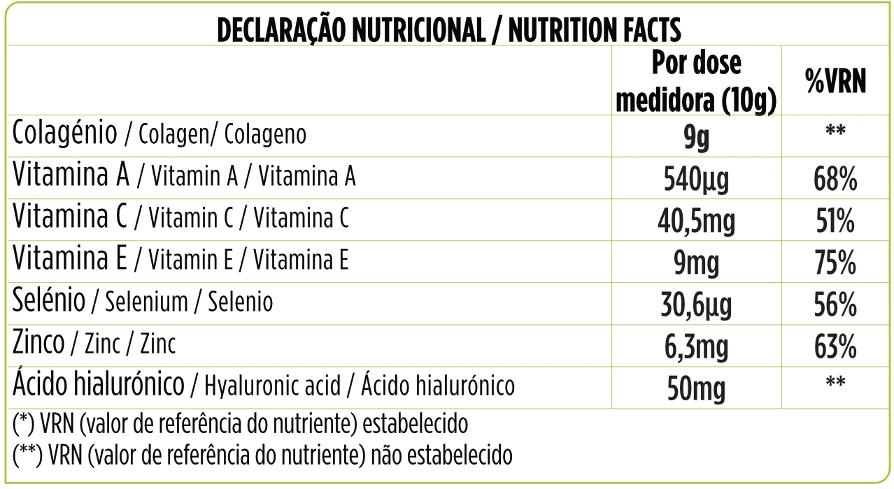 Suplemento de colagénio, com ácido hialurónico e um mix de vitaminas e minerais.